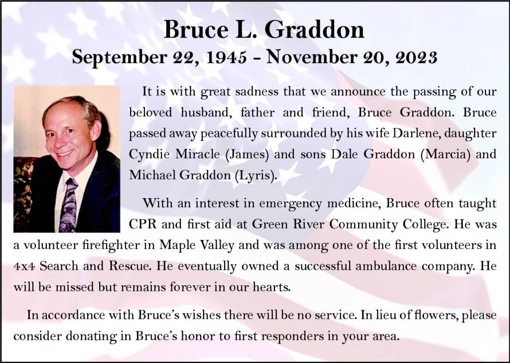 With an interest in emergency medicine, Bruce often taught CPR and first aid at Green River Community College. He was a volunteer firefighter in Maple Valley and was among one of the first volunteers in 4×4 Search and Rescue. He eventually owned a successful ambulance company. He will be missed but remains forever in our hearts.