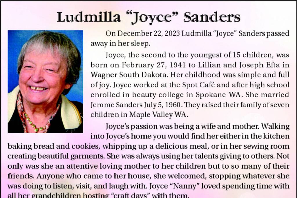 On December 22, 2023 Ludmilla “Joyce” Sanders passed away in her sleep.