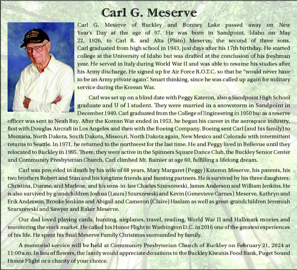 Carl G. Meserve of Buckley and Bonney Lake passed away on New Year’s Day at the age of 97. He was born in Sandpoint, Idaho on May22, 1926, to Carl R. and Alta (Plato) Meserve, the second of three sons.