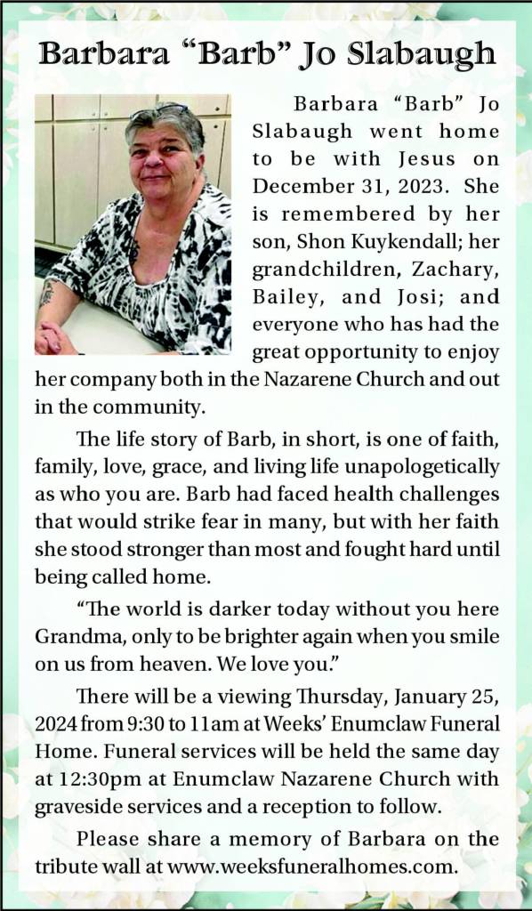 Barbara “Barb” Jo Slabaugh went home to be with Jesus on December 31, 2023. She