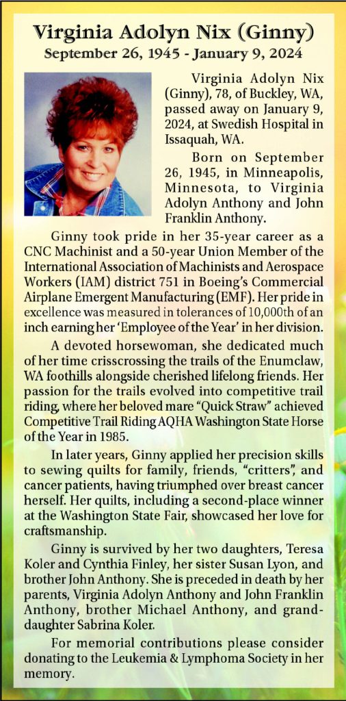 Virginia Adolyn Nix (Ginny), 78, of Buckley, WA, passed away on January 9, 2024, at Swedish Hospital in Issaquah, WA.