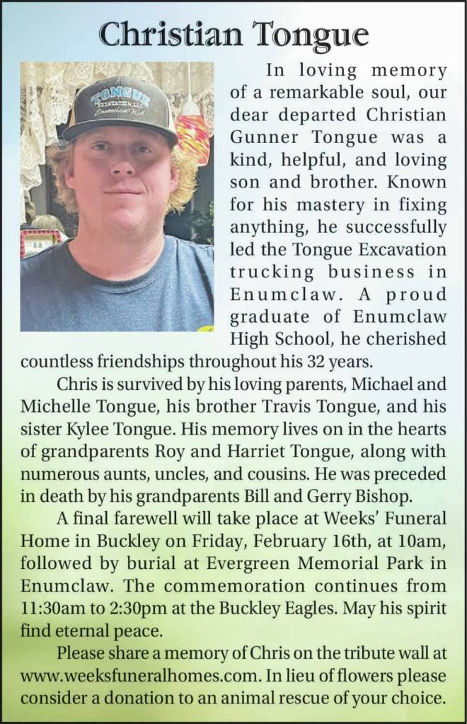 In loving memory of a remarkable soul, our dear departed Christian Gunner Tongue was a kind, helpful, and loving son and brother. Known for his mastery in fixing anything, he successfully led the Tongue Excavation trucking business in Enumclaw. A proud graduate of Enumclaw High School, he cherished countless friendships throughout his 32 years.