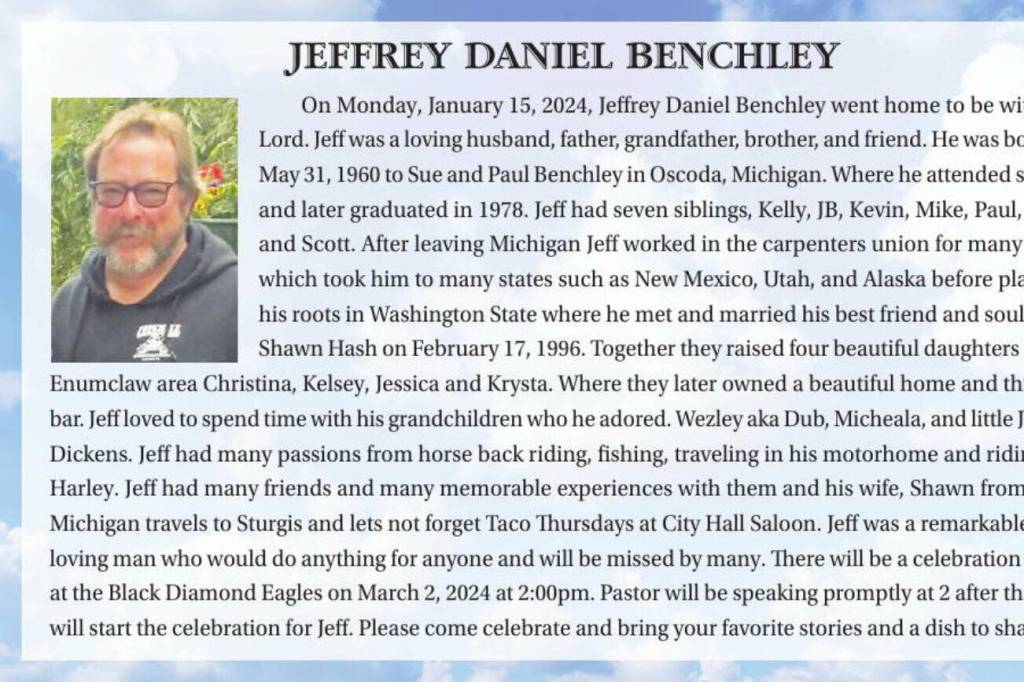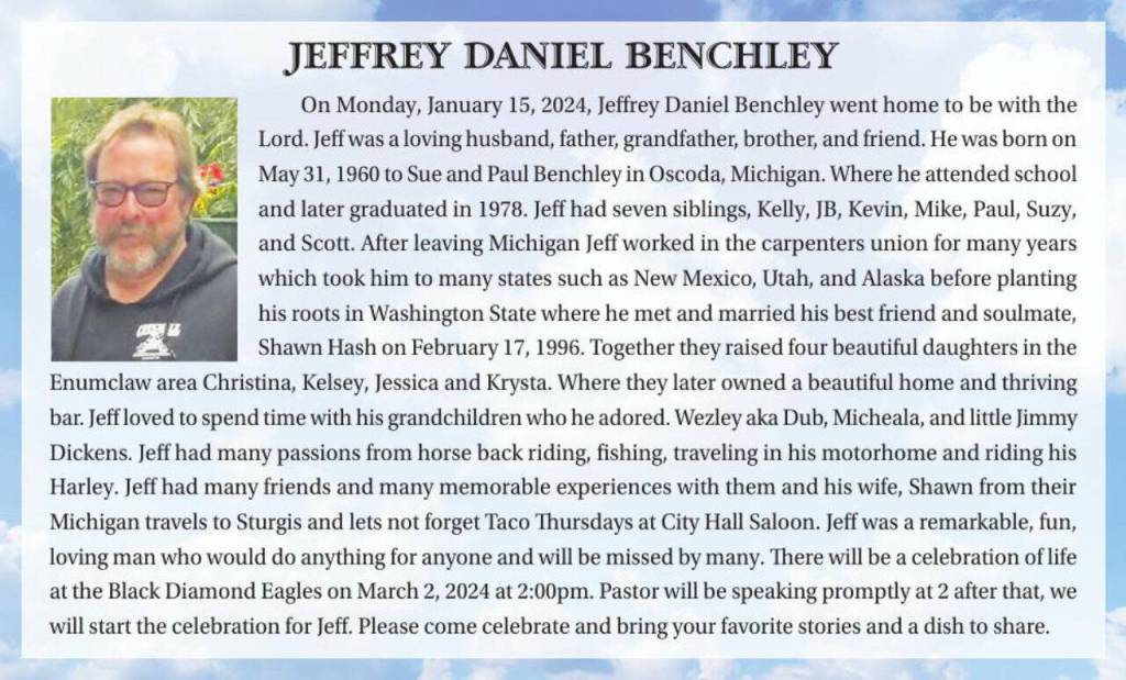 On Monday, January 15, 2024, Jeffrey Daniel Benchley went home to be with the Lord. Jeff was a loving husband, father, grandfather, brother, and friend. He was born on May 31, 1960 to Sue and Paul Benchley in Oscoda, Michigan. Where he attended school and later graduated in 1978. Jeff had seven siblings, Kelly, JB, Kevin, Mike, Paul, Suzy, and Scott. After leaving Michigan Jeff worked in the carpenters union for many years which took him to many states such as New Mexico, Utah, and Alaska before planting his roots in Washington State where he met and married his best friend and soulmate, Shawn Hash on February 17, 1996. Together they raised four beautiful daughters in the Enumclaw area Christina, Kelsey, Jessica and Krysta. Where they later owned a beautiful home and thriving bar. Jeff loved to spend time with his grandchildren who he adored. Wezley aka Dub, Micheala, and little Jimmy Dickens. Jeff had many passions from horse back riding, fishing, traveling in his motorhome and riding his Harley. Jeff had many friends and many memorable experiences with them and his wife, Shawn from their Michigan travels to Sturgis and lets not forget Taco Thursdays at City Hall Saloon. Jeff was a remarkable, fun, loving man who would do anything for anyone and will be missed by many. There will be a celebration of life at the Black Diamond Eagles on March 2, 2024 at 2:00pm. Pastor will be speaking promptly at 2 after that, we will start the celebration for Jeff. Please come celebrate and bring your favorite stories and a dish to share.