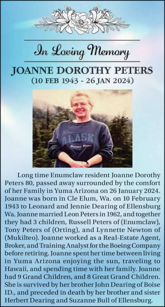 Long time Enumclaw resident Joanne Dorothy Peters 80, passed away surrounded by the comfort of her Family in Yuma Arizona on 26 January 2024.