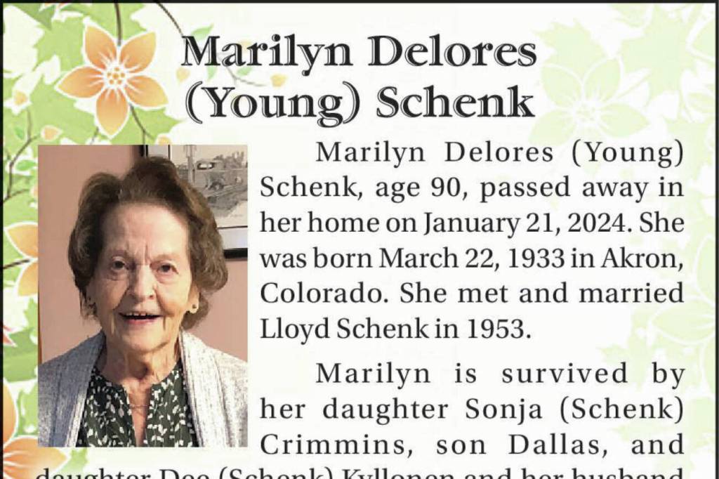 Marilyn Delores (Young) Schenk, age 90, passed away in her home on January 21, 2024. She was born March 22, 1933 in Akron, Colorado. She met and married Lloyd Schenk in 1953.