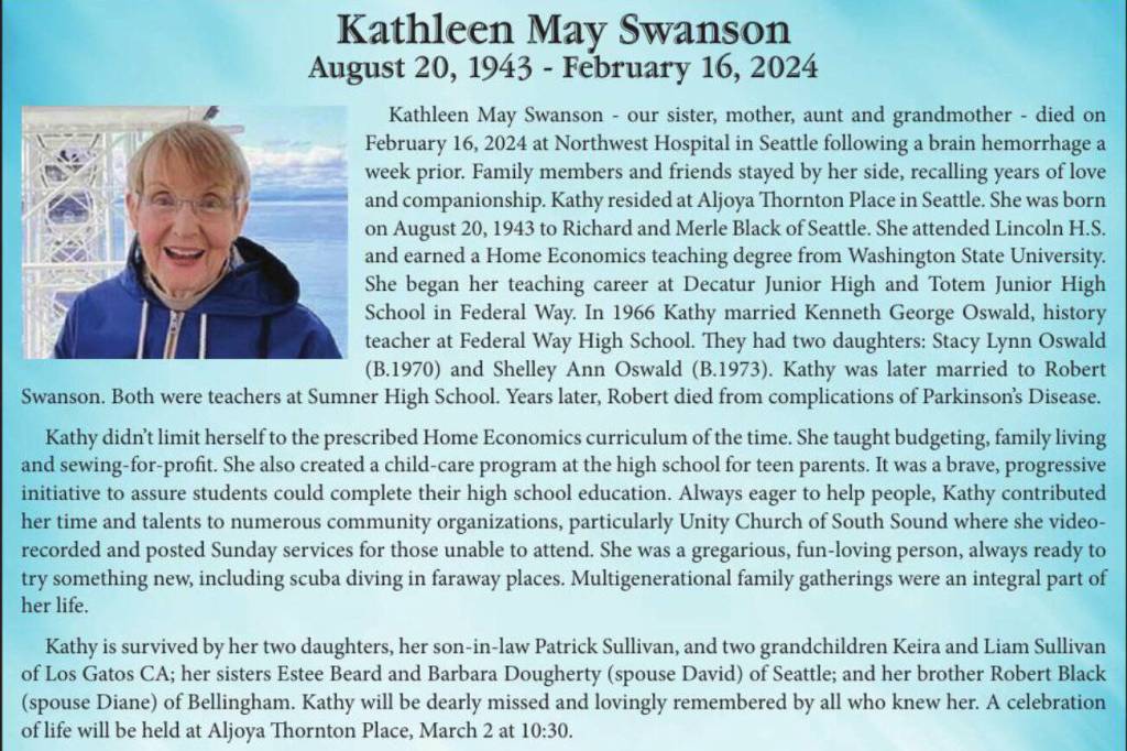 Kathleen May Swanson – our sister, mother, aunt and grandmother – died on February 16, 2024 at Northwest Hospital in Seattle following a brain hemorrhage a week prior. Family members and friends stayed by her side, recalling years of love and companionship. Kathy resided at Aljoya Thornton Place in Seattle. She was born on August 20, 1943 to Richard and Merle Black of Seattle. She attended Lincoln H.S. and earned a Home Economics teaching degree from Washington State University.