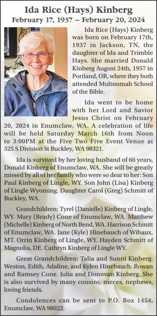 Ida is survived by her loving husband of 66 years, Donald Kinberg of Enumclaw, WA. She will be greatly missed by all of her family who were so dear to her: Son Paul Kinberg of Lingle, WY. Son John (Lisa) Kinberg of Lingle Wyoming. Daughter Carol (Greg) Schmitt of Buckley, WA.