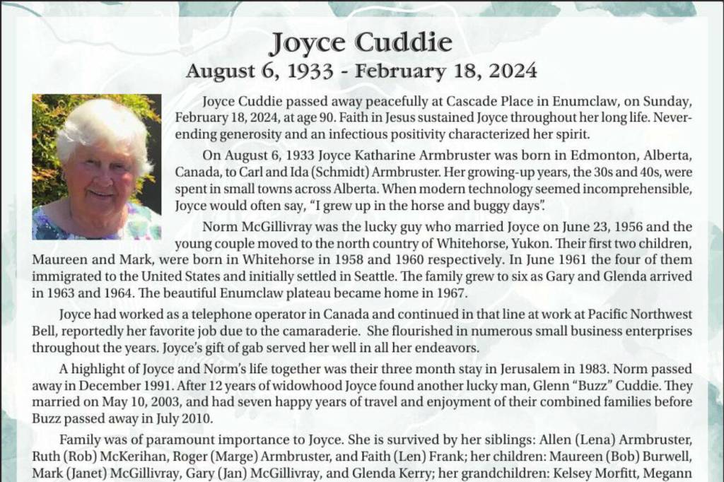 Joyce Cuddie passed away peacefully at Cascade Place in Enumclaw, on Sunday, February 18, 2024, at age 90. Faith in Jesus sustained Joyce throughout her long life. Never- ending generosity and an infectious positivity characterized her spirit.