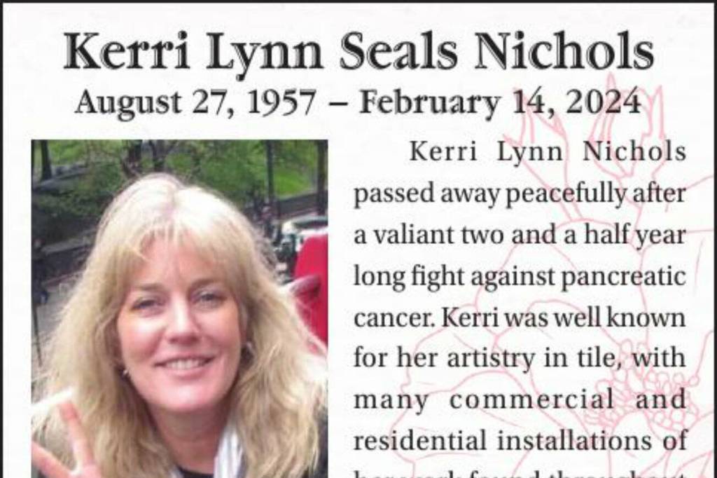 Kerri Lynn Nichols passed away peacefully after a valiant two and a half year long fight against pancreatic cancer. Kerri was well known for her artistry in tile, with many commercial and residential installations of her work found throughout the Pacific Northwest.