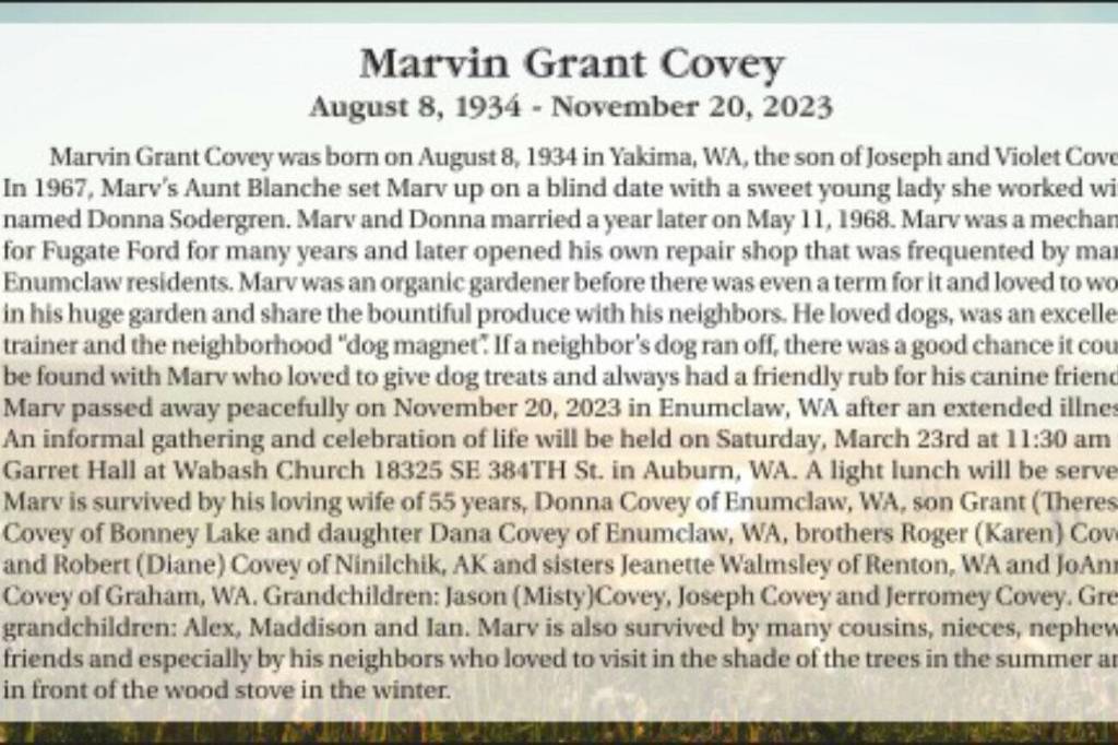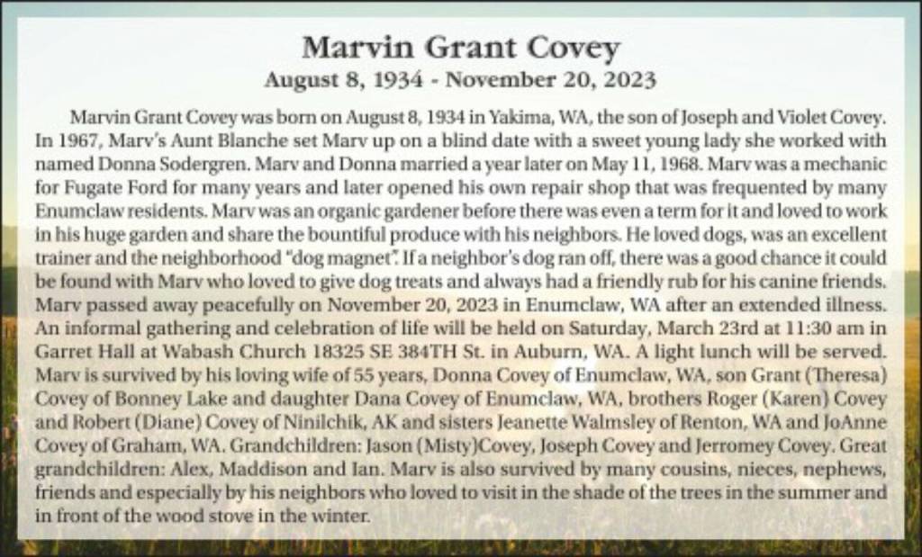 Marv is survived by his loving wife of 55 years, Donna Covey of Enumclaw, WA, son Grant (Theresa) Covey of Bonney Lake and daughter Dana Covey of Enumclaw, WA, brothers Roger (Karen) Covey and Robert (Diane) Covey of Ninilchik, AK and sisters Jeanette Walmsley of Renton, WA and JoAnne Covey of Graham, WA. Grandchildren: Jason (Misty) Covey, Joseph Covey and Jerromey Covey.
