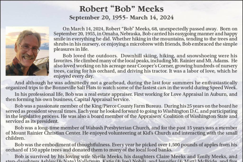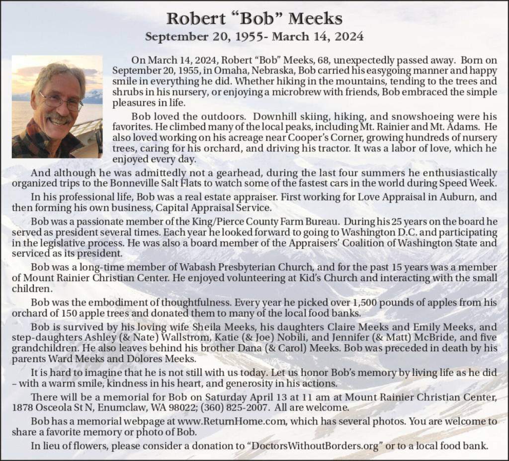 On March 14, 2024, Robert “Bob” Meeks, 68, unexpectedly passed away. Born on September 20, 1955, in Omaha, Nebraska, Bob carried his easygoing manner and happy smile in everything he did. Whether hiking in the mountains, tending to the trees and shrubs in his nursery, or enjoying a microbrew with friends, Bob embraced the simple pleasures in life.