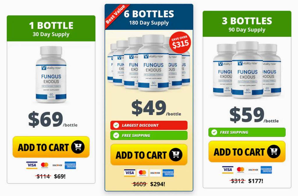 Vitality Now’s Fungus Exodus is available for purchase exclusively online through the official Vitality Now website. The product is offered in three pricing tiers to accommodate different needs and preferences, allowing customers to choose according to their requirements. Here’s a brief overview of the pricing structure: