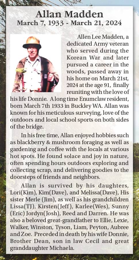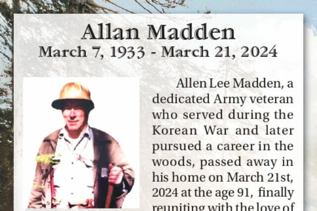 Allen Lee Madden, a dedicated Army veteran who served during the Korean War and later pursued a career in the woods, passed away in his home on March 21st, 2024 at the age 91, finally reuniting with the love of