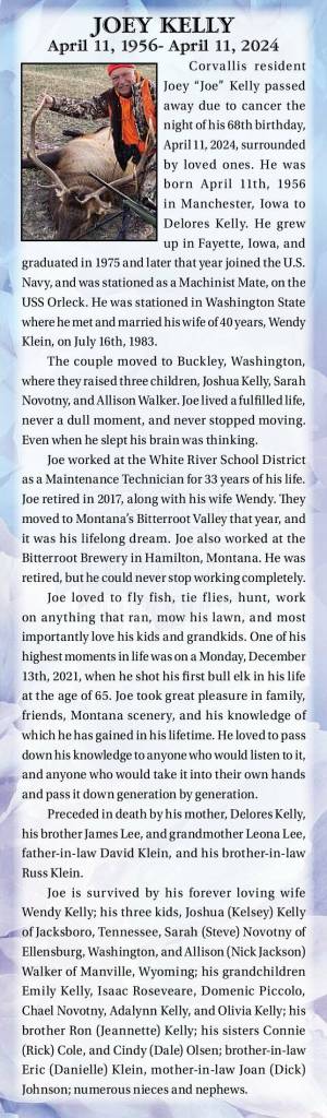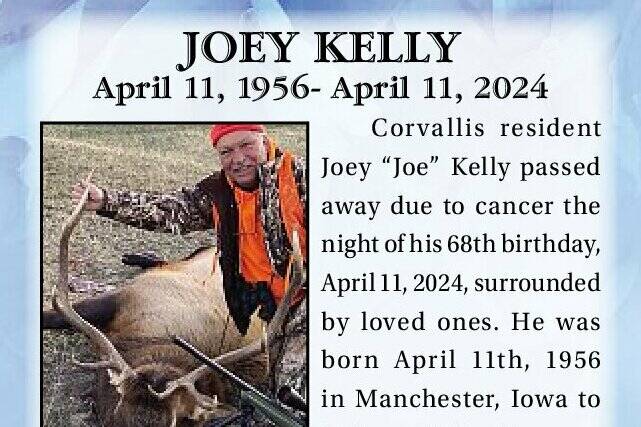 Corvallis resident Joey “Joe” Kelly passed away due to cancer the night of his 68th birthday, April 11, 2024, surrounded by loved ones. He was born April 11th, 1956 in Manchester, Iowa to Delores Kelly. He grew up in Fayette, Iowa, and graduated in 1975 and later that year joined the U.S. Navy, and was stationed as a Machinist Mate, on the USS Orleck. He was stationed in Washington State where he met and married his wife of 40 years, Wendy Klein, on July 16th, 1983.