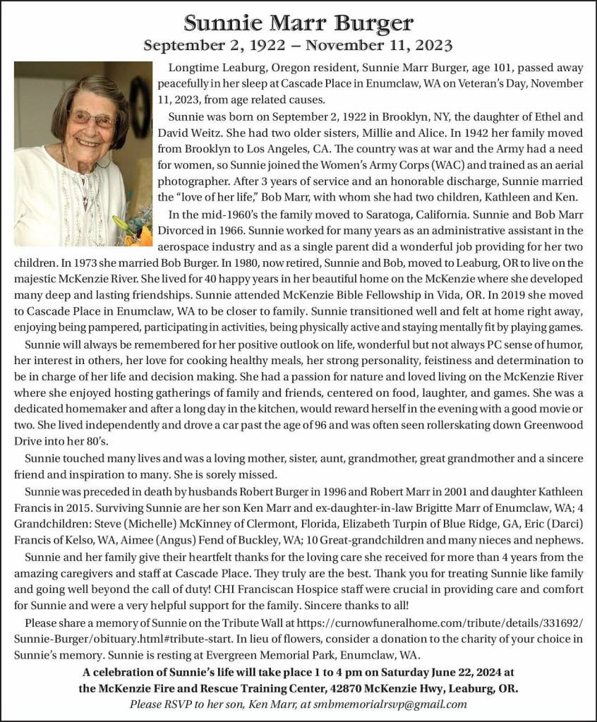 Longtime Leaburg, Oregon resident, Sunnie Marr Burger, age 101, passed away peacefully in her sleep at Cascade Place in Enumclaw, WA on Veteran’s Day, November 11, 2023, from age related causes.
