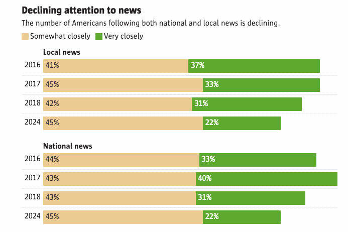 But I can’t stop thinking about the rest of Pew’s survey, released May 7, which found people are paying less attention to news and turning to non-journalism sources to get informed.