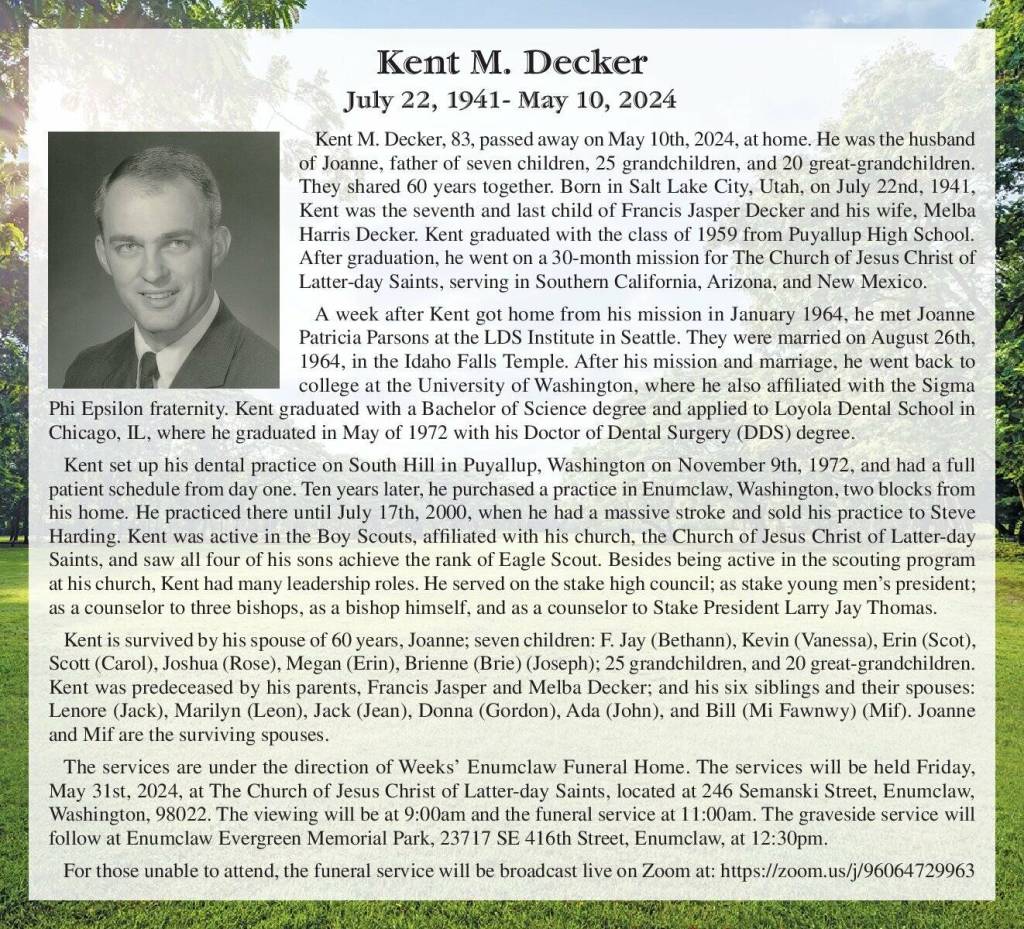 Kent M. Decker, 83, passed away on May 10th, 2024, at home. He was the husband of Joanne, father of seven children, 25 grandchildren, and 20 great-grandchildren. They shared 60 years together. Born in Salt Lake City, Utah, on July 22nd, 1941, Kent was the seventh and last child of Francis Jasper Decker and his wife, Melba Harris Decker. Kent graduated with the class of 1959 from Puyallup High School. After graduation, he went on a 30-month mission for The Church of Jesus Christ of Latter-day Saints, serving in Southern California,Arizona, and New Mexico.