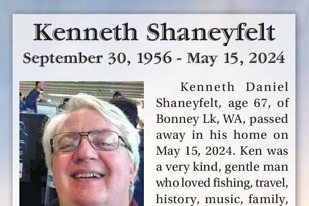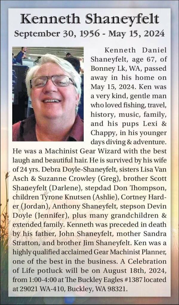Kenneth Daniel Shaneyfelt, age 67, of Bonney Lake, WA, passed away in his home on May 15, 2024. Ken was a very kind, gentle man who loved fishing, travel, history, music, family, and his pups Lexi and Chappy, in his younger days diving and adventure.