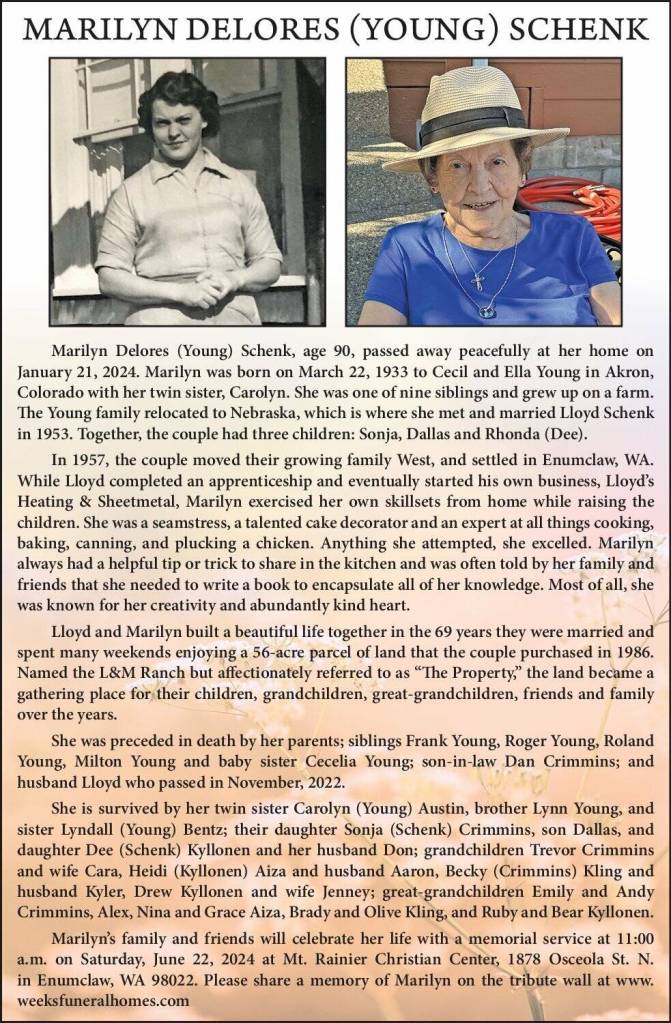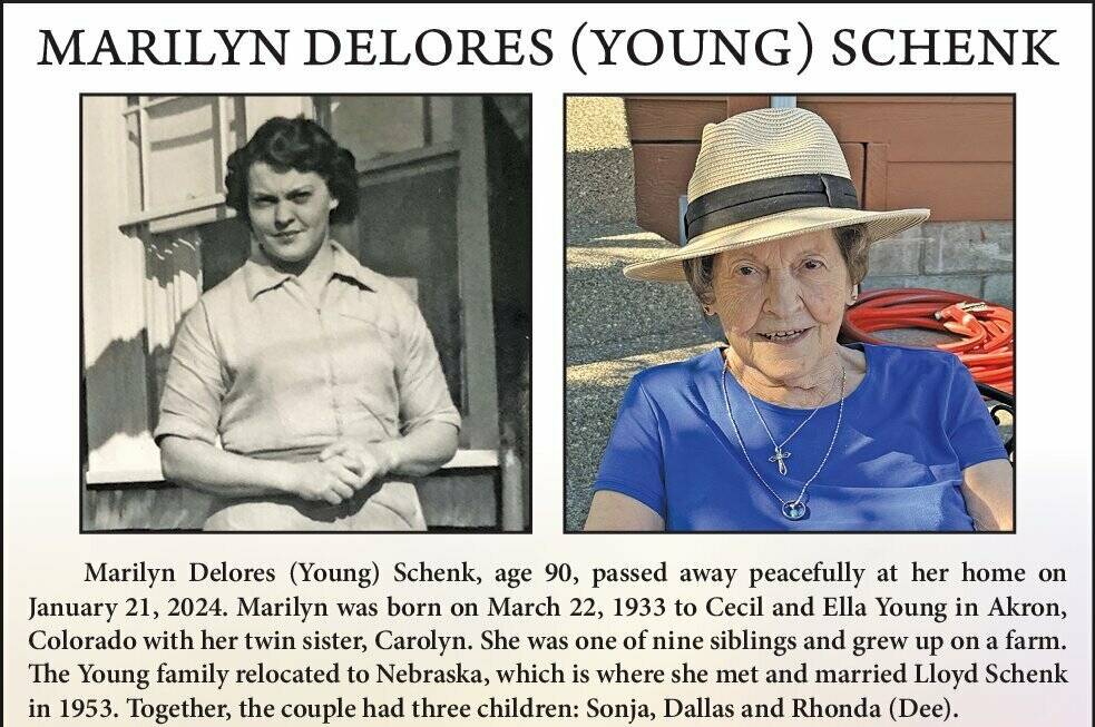 Marilyn Delores (Young) Schenk, age 90, passed away peacefully at her home on January 21, 2024. Marilyn was born on March 22, 1933 to Cecil and Ella Young in Akron, Colorado with her twin sister, Carolyn. She was one of nine siblings and grew up on a farm. The Young family relocated to Nebraska, which is where she met and married Lloyd Schenk in 1953. Together, the couple had three children: Sonja, Dallas and Rhonda (Dee).