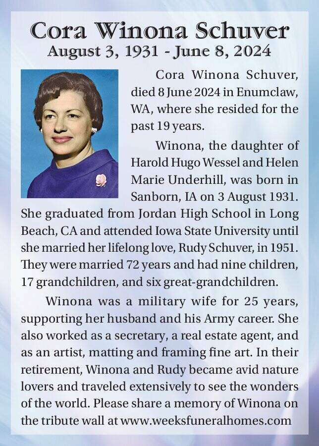 Cora Winona Schuver, died 8 June 2024 in Enumclaw, WA, where she resided for the past 19 years.