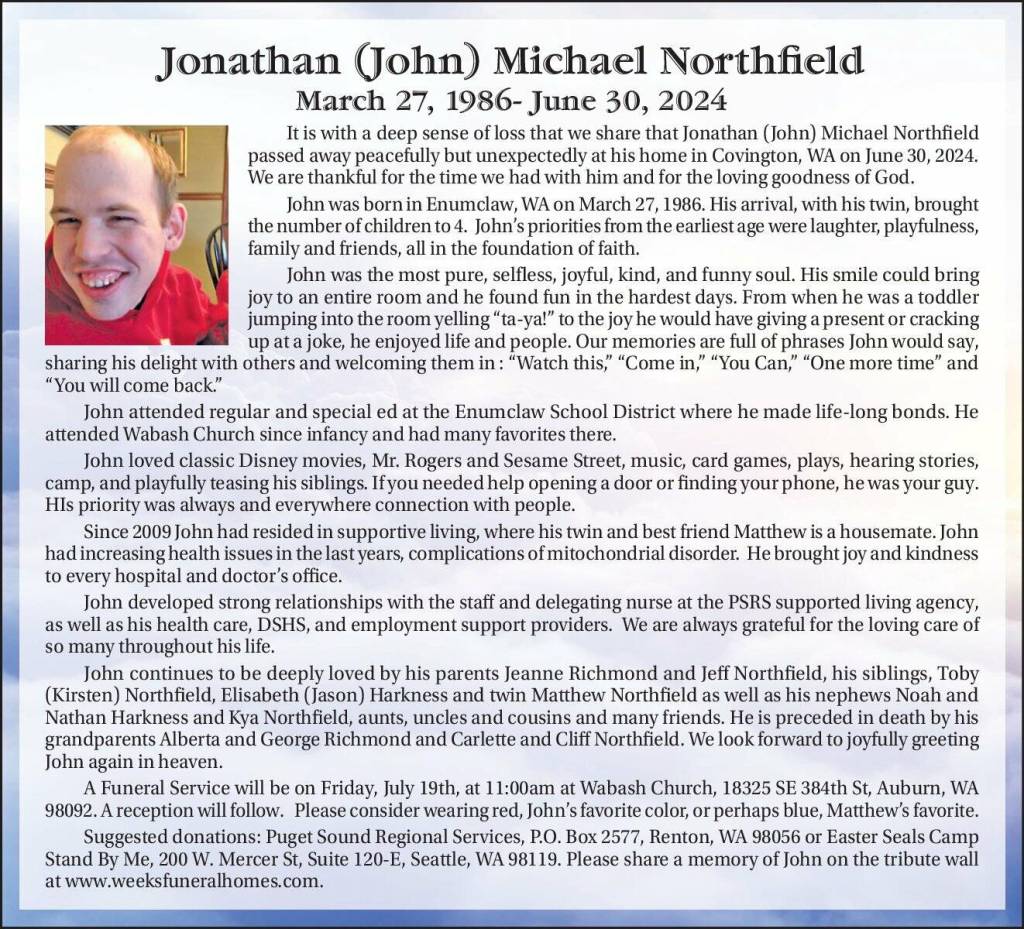 Suggested donations: Puget Sound Regional Services, P.O. Box 2577, Renton, WA 98056 or Easter Seals Camp Stand By Me, 200 W. Mercer St, Suite 120-E, Seattle, WA 98119. Please share a memory of John on the tribute wall at www.weeksfuneralhomes.com.