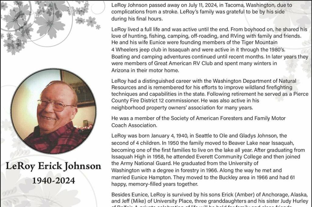 LeRoy Johnson passed away on July 11, 2024, in Tacoma, Washington, due to complications from a stroke. LeRoy’s family was grateful to be by his side during his final hours.