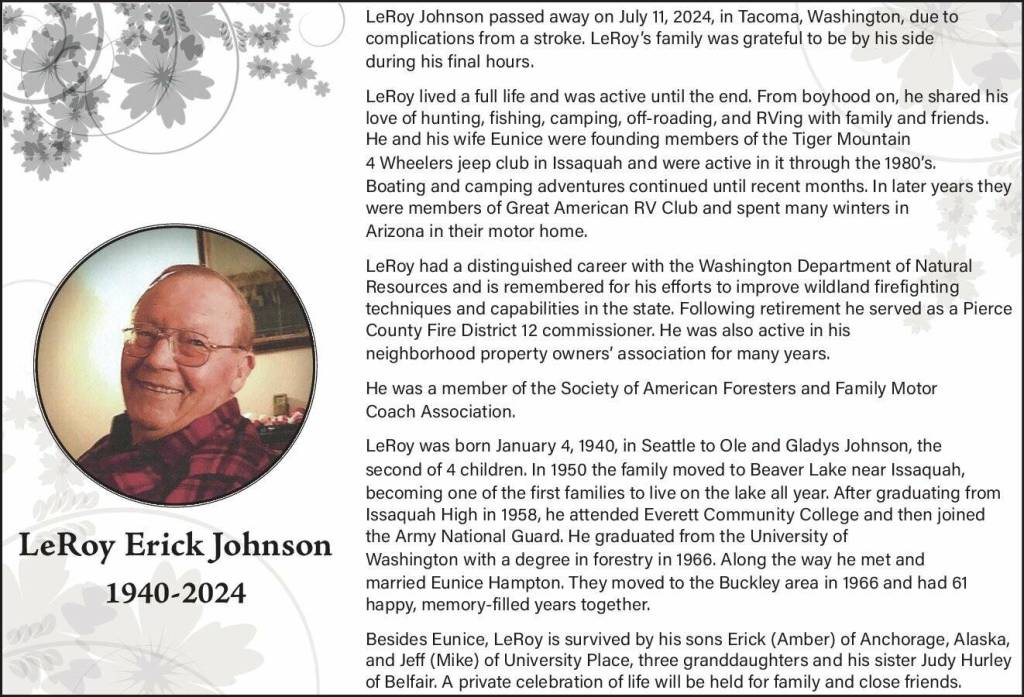 LeRoy was born January 4, 1940, in Seattle to Ole and Gladys Johnson, the second of 4 children. In 1950 the family moved to Beaver Lake near Issaquah, becoming one of the first families to live on the lake all year. After graduating from Issaquah High in 1958, he attended Everett Community College and then joined the Army National Guard. He graduated from the University of