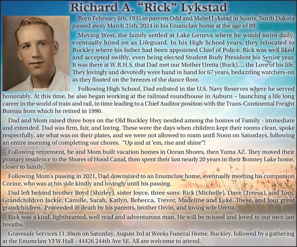 Moving West, the family settled at Lake Geneva where he would swim daily, eventually hired on as Lifeguard. In his High School years, they relocated to Buckley where his father had been appointed Chief of Police. Rick was well liked and accepted swiftly, even being elected Student Body President his Senior year. It was there at W.R.H.S. that Dad met our Mother Uretta (Bock)…. the Love of his life. They lovingly and devotedly were hand in hand for 67 years, bedazzling watchers-on as they floated on the breezes of the dance floor.