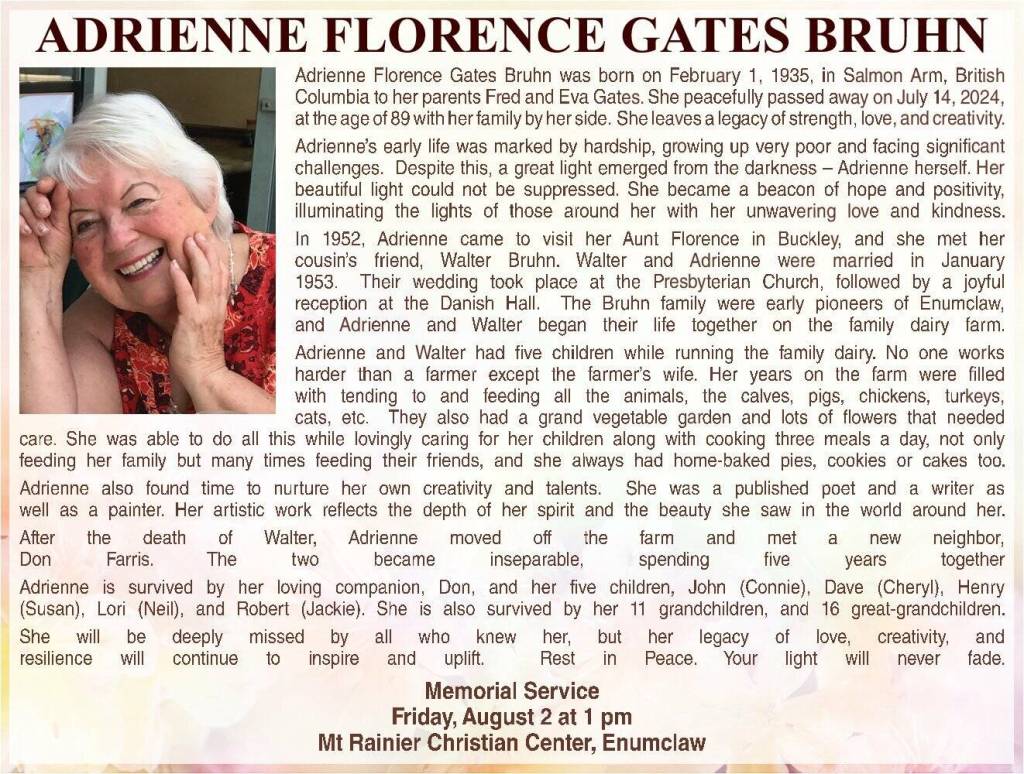 Adrienne Florence Gates Bruhn was born on February 1, 1935, in Salmon Arm, British Columbia to her parents Fred and Eva Gates. She peacefully passed away on July 14, 2024, at the age of 89 with her family by her side. She leaves a legacy of strength, love, and creativity.