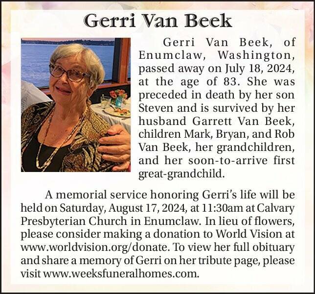 Gerri Van Beek, of Enumclaw, Washington, passed away on July 18, 2024, at the age of 83. She was preceded in death by her son Steven and is survived by her husband Garrett Van Beek, children Mark, Bryan, and Rob Van Beek, her grandchildren, and her soon-to-arrive first great-grandchild.