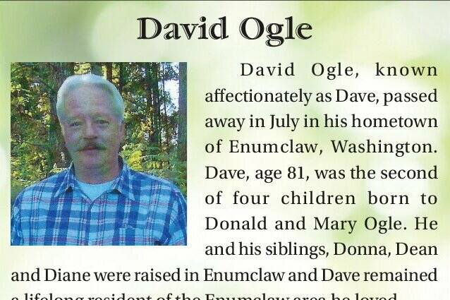 Dave, age 81, was the second of four children born to Donald and Mary Ogle. He and his siblings, Donna, Dean and Diane were raised in Enumclaw and Dave remained a lifelong resident of the Enumclaw area he loved.