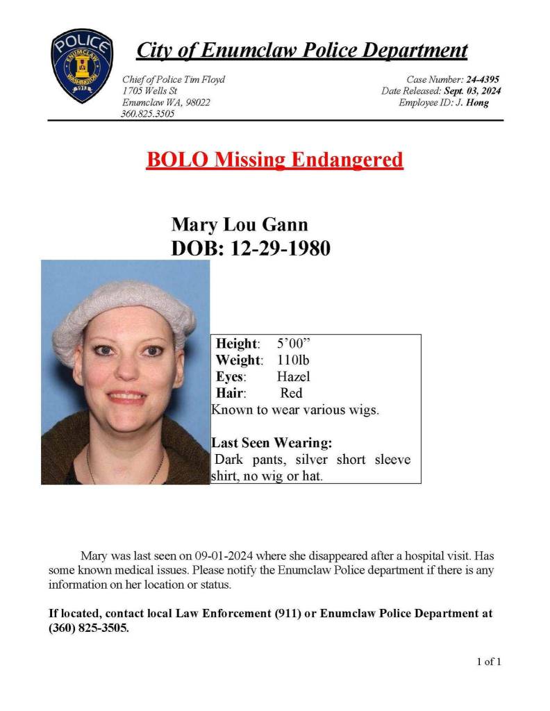 According to the Enumclaw Police Department, Mary Lou Gann has been located and is safe.