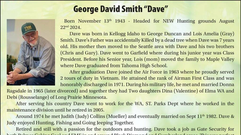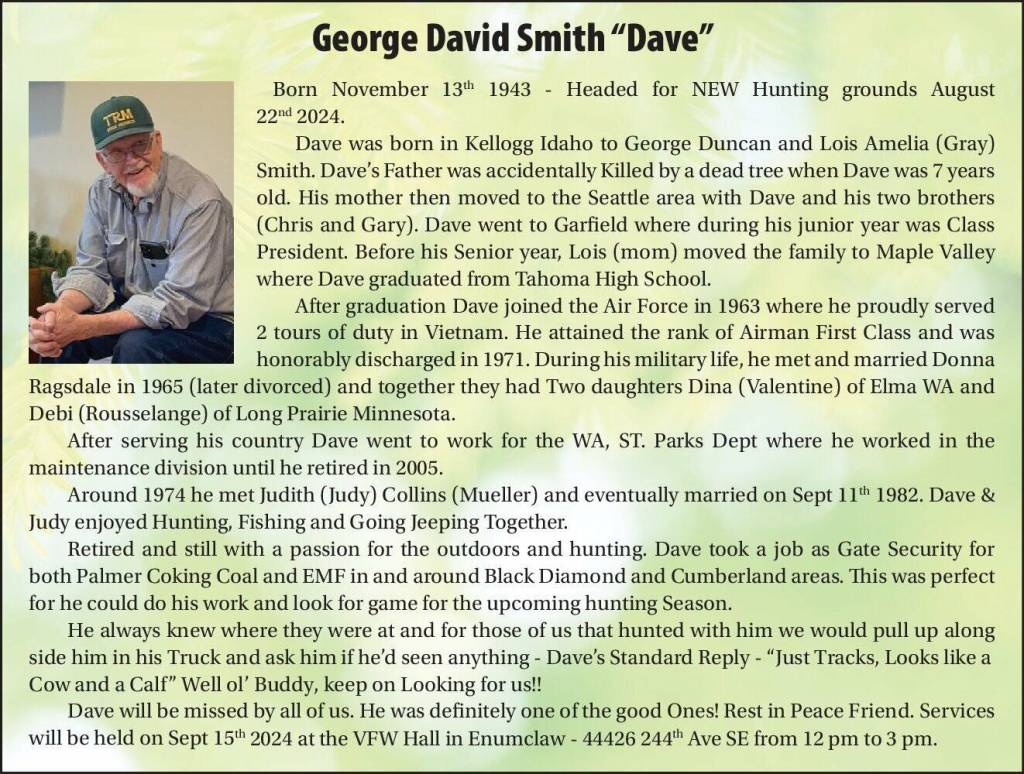 Dave will be missed by all of us. He was definitely one of the good Ones! Rest in Peace Friend. Services will be held on Sept 15th 2024 at the VFW Hall in Enumclaw – 44426 244th Ave SE from 12 pm to 3 pm.