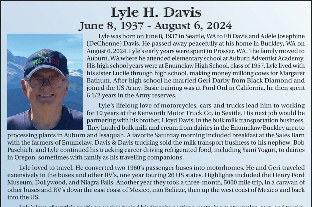 Lyle was born on June 8, 1937 in Seattle, WA to Eli Davis and Adele Josephine (DeChenne) Davis. He passed away peacefully at his home in Buckley, WA on August 6, 2024. Lyle’s early years were spent in Prosser, WA.The family moved to Auburn, WA where he attended elementary school at Auburn Adventist Academy.