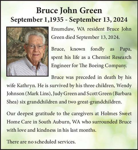 Enumclaw, WA resident Bruce John Green died September 13, 2024.