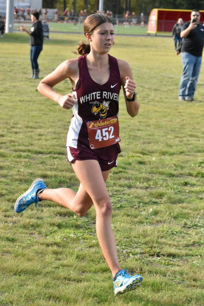 White River (top seven, overall placing): Paeton Poelman, first place, 20:17; Vivian Kingston, second, 20:24; Victoria Blakley, third, 20:29; Nativity Leddy, fifth, 22:03; Paityn Kaydus, sixth, 23:32; Naomi Carthum, seventh, 24:46; Taylor Simon, 12th, 25:41.