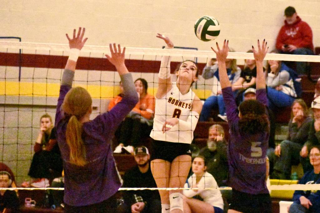 The EHS Hornets split two matches at Foss High on Day 1 of the tourney, opening with a 3-1 loss to the Lakes Lancers. Facing elimination, coach Barbie Becker’s crew bounced back with a decisive 3-0 victory over Kent-Meridian. It was the third time this season EHS had faced the Royals, a fellow member of the 3A NPSL, and the third time the Hornets posted a 3-0 decision.