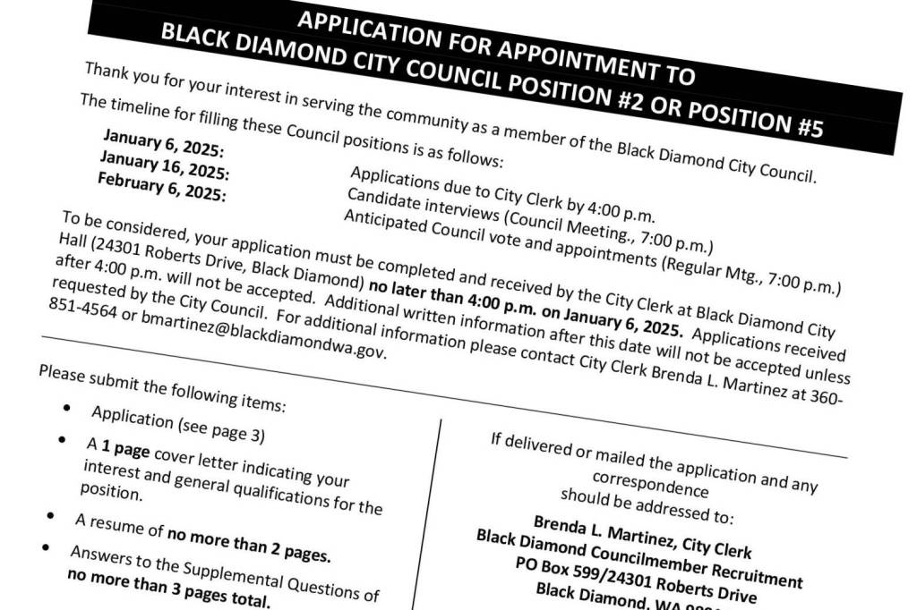Application forms may be obtained at City Hall, located at 24301 Roberts Drive, Black Diamond, WA 98010 or on the City’s website www.blackdiamondwa.gov under “Public Notices” on the homepage. Applications must be received at City Hall by 4:00 p.m. on January 6, 2025. A mailing postmark will not be accepted.