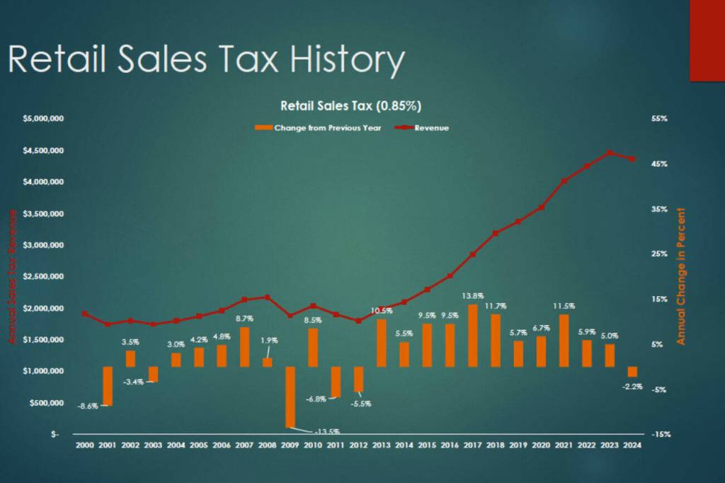 However, sales tax revenue is expected to decrease by 8% for a total of $4.9 million, and the $38,600 loss is enough to wipe out the property tax gains.