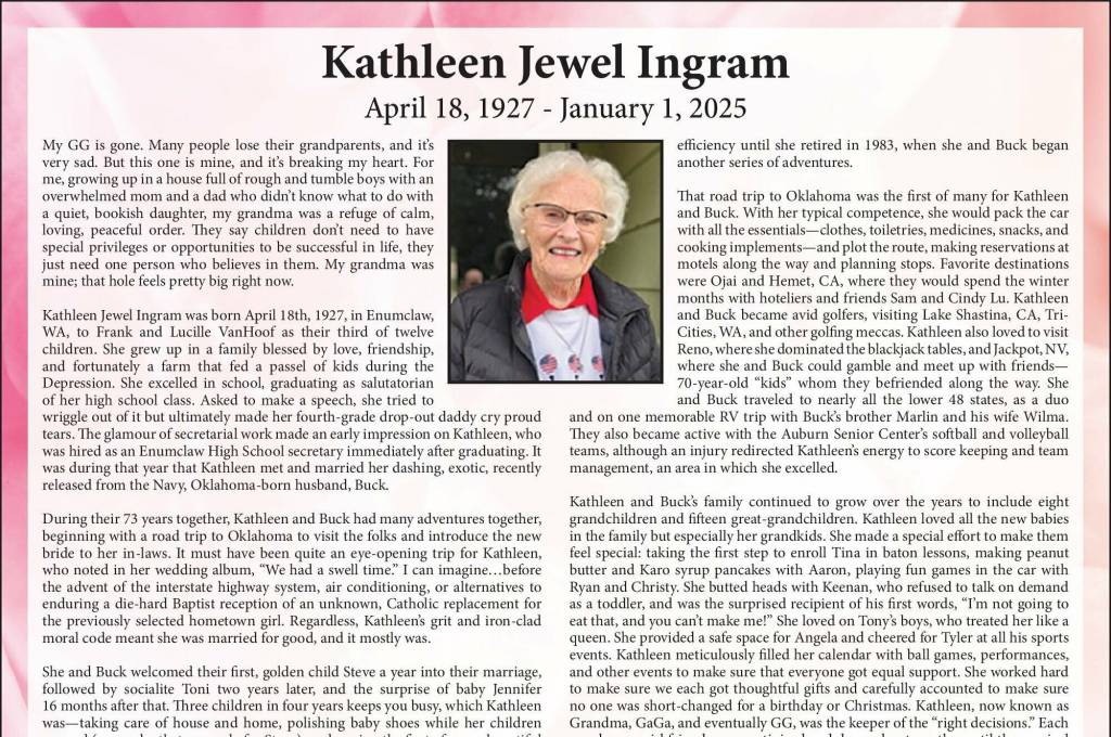 Kathleen was preceded in death by her parents, Buck, brothers Les, Dan, Don, Chuck, and Fred, and sisters Vivian, Clara, and Nadine. She is survived by her sisters Donna and Caroline, brother Frank, her children, grandchildren, and great-grandchildren. She will be celebrated at Mass at Sacred Heart Catholic Church in Enumclaw at 9:00 on January 10, 2025, followed by a reception at Sacred Heart. Kathleen will be laid to rest with Buck at the Enumclaw Cemetery after the reception.