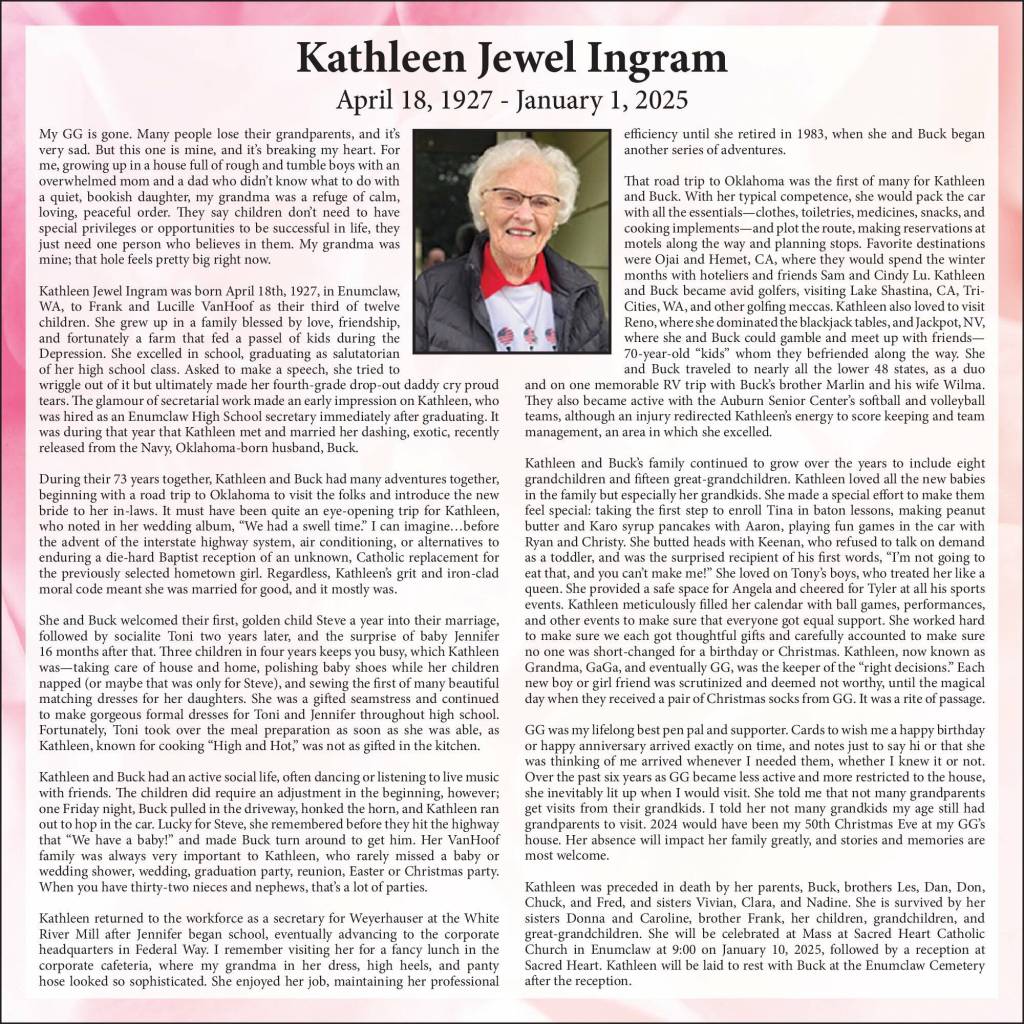 Kathleen Jewel Ingram was born April 18th, 1927, in Enumclaw, WA, to Frank and Lucille VanHoof as their third of twelve children. She grew up in a family blessed by love, friendship, and fortunately a farm that fed a passel of kids during the Depression. She excelled in school, graduating as salutatorian of her high school class. Asked to make a speech, she tried to wriggle out of it but ultimately made her fourth-grade drop-out daddy cry proud tears.The glamour of secretarial work made an early impression on Kathleen, who was hired as an Enumclaw High School secretary immediately after graduating. It was during that year that Kathleen met and married her dashing, exotic, recently released from the Navy, Oklahoma-born husband, Buck.