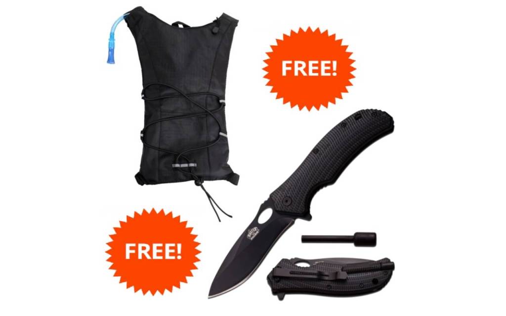 The purchase includes a free hydration backpack and a free MasterStrike Ballistic Knife, offering great value in addition to the main products.