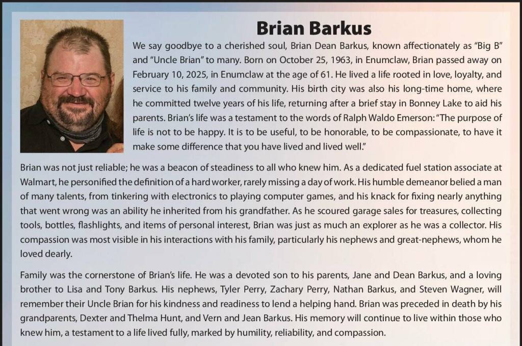We say goodbye to a cherished soul, Brian Dean Barkus, known affectionately as “Big B” and “Uncle Brian” to many. Born on October 25, 1963, in Enumclaw, Brian passed away on February 10, 2025, in Enumclaw at the age of 61. He lived a life rooted in love, loyalty, and service to his family and community. His birth city was also his long-time home, where he committed twelve years of his life, returning after a brief stay in Bonney Lake to aid his parents. Brian’s life was a testament to the words of RalphWaldo Emerson: “The purpose of life is not to be happy. It is to be useful, to be honorable, to be compassionate, to have it make some difference that you have lived and lived well.”
