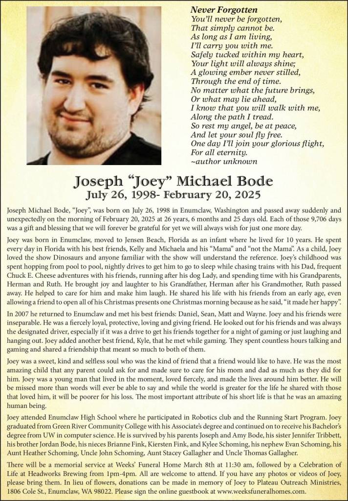 Joseph Michael Bode, “Joey”, was born on July 26, 1998 in Enumclaw, Washington and passed away suddenly and unexpectedly on the morning of February 20, 2025 at 26 years, 6 months and 25 days old. Each of those 9,706 days was a gift and blessing that we will forever be grateful for yet we will always wish for just one more day.