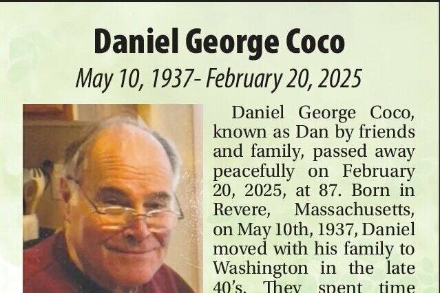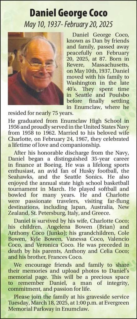Daniel George Coco, known as Dan by friends and family, passed away peacefully on February 20, 2025, at 87. Born in Revere, Massachusetts, on May 10th, 1937, Daniel moved with his family to Washington in the late 40’s. They spent time in Seattle and Poulsbo before finally settling in Enumclaw, where he resided for nearly 75 years.