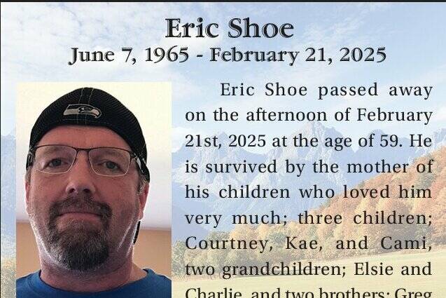 Eric Shoe passed away on the afternoon of February 21st, 2025 at the age of 59. He is survived by the mother of his children who loved him very much; three children; Courtney, Kae, and Cami, two grandchildren; Elsie and Charlie, and two brothers; Greg and Patrick.