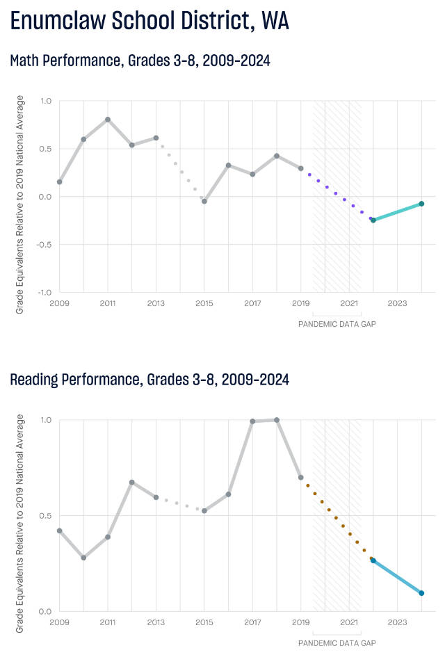 But as the national average continued to decline between 2021 and 2024, Enumclaw’s math scores improved, and ERS estimates Enumclaw students are now scoring half a grade level above the 2024 national average.