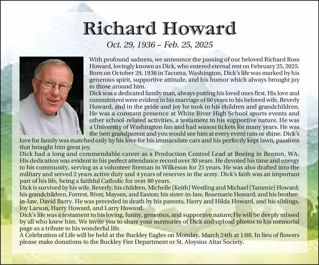 Dick is survived by his wife, Beverly; his children,Michelle (Keith)Westling andMichael (Tammie)Howard; his grandchildren, Forrest, River, Maysen, and Easton; his sister-in-law, RosemarieHoward; and his brother-in- law, David Barry. He was preceded in death by his parents, Harry and Hilda Howard, and his siblings, Joy Larson, Harry Howard, and Larry Howard.