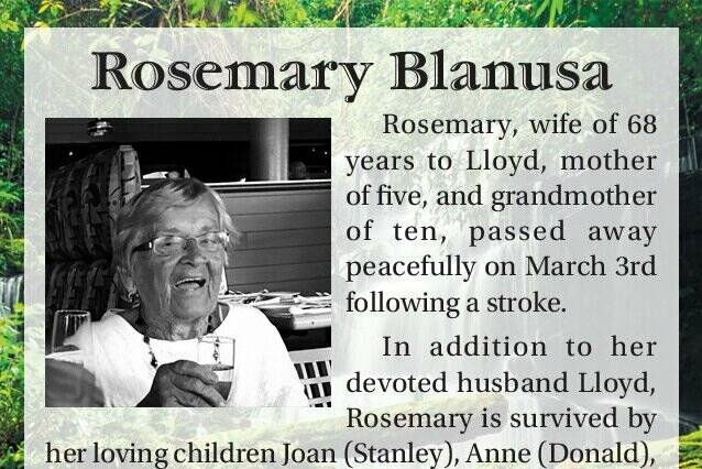 Rosemary, wife of 68 years to Lloyd, mother of five, and grandmother of ten, passed away peacefully on March 3rd following a stroke.