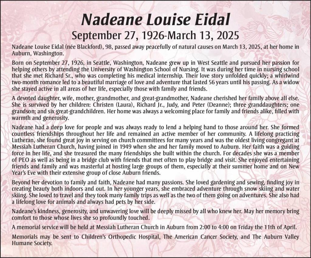 Nadeane Louise Eidal (née Blackford), 98, passed away peacefully of natural causes on March 13, 2025, at her home in Auburn, Washington.